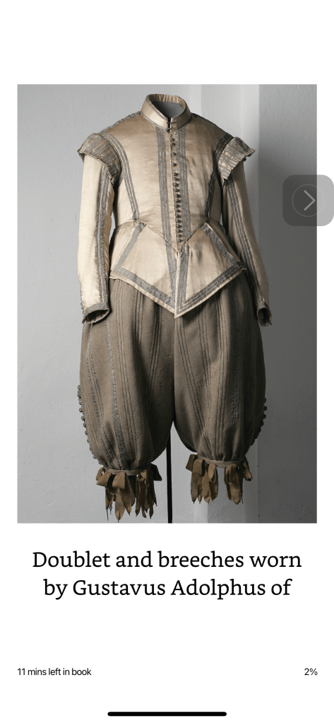 At the start of the seventeenth century, the male “suit” consisted of a doublet with sharply pointed waistline with long overlapping square tabs, shoulder wings, and, by 1620, a high standing collar. (Even though the codpiece had by now fallen from fashion, the pointed waistline was enough to still, in Susan Doran’s words, “[draw] attention to a man’s haunches and private parts.”9) The waistline gradually rose until it was fairly high, creating a truncated torso that sat above a waistline sometimes bolstered with decorative ribbon loops. However, by the 1630s the most common and fashionable hose were long and straight, finishing past the knee where they were met by a pair of boots. This created a taller figure than seen in the previous century, as well as a far softer and more easy-wearing set of clothes. Doublet and breeches worn by Gustavus Adolphus of Sweden, c.1620s, Royal Armory, Stockholm
