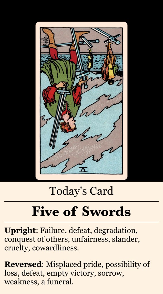 The upright card depicts the battle, whereas the reversed describes the outcome. Wisely one can alter the course of events by avoiding attitudes blinding one to possible ego-driven pitfalls. There may be residual resentment following a recent or past argument with someone close to you. You’ve had some very challenging and heated conversations and may still harbor negative emotions from these discussions. If the conflict remains unresolved and unaddressed, it may impact your ability to create a harmonious relationship. The Five of Swords reversed in your reading suggests that you are ready to move forward with your life and make positive changes. It’s time to bring your energy back within and ground yourself. Come back to that beautiful, soulful person you are and ask yourself: how can I help create a win-win solution here? It may mean a compromise, or it might be time to move on with your life. so you can go forward to other pastures and create a more fertile ground for new ideas, collaborations, and victories. (EZM)