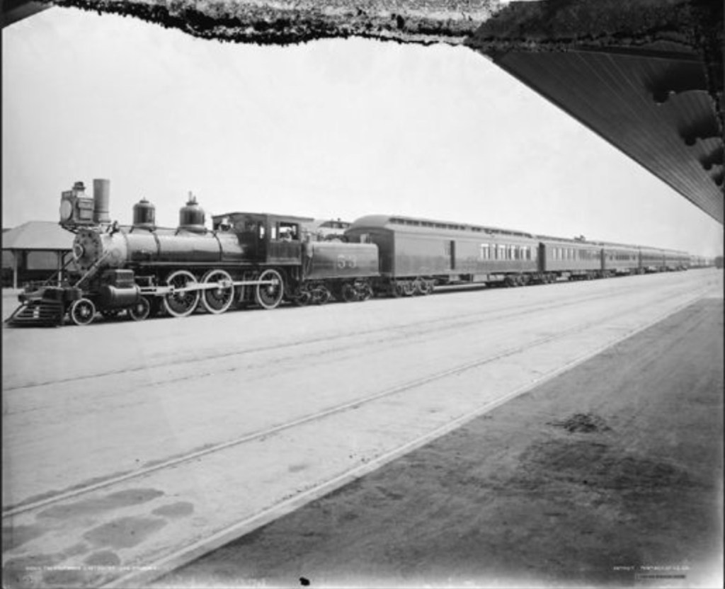 Inaugurated in 1892, the California Limited became the first of the Santa Fe’s crack passenger trains between Chicago and Los Angeles; here engine no. 53, a 4-6-0 ten-wheeler, waits with its consist at La Grande Station in Los Angeles. (Colorado Historical Society, scan 20104180, W. H. Jackson Collection)
