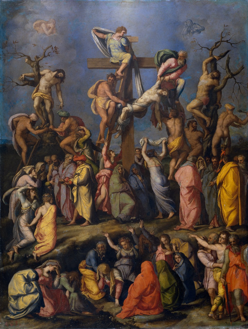 Christ´s dead body is taken off the Cross by Joseph of Arimathea, Nicodemus and Saint John the Evangelist. Among the people at his feet are the Virgin Mary, the mother of Joseph —also called Mary— as well as Salomé and Mary Magdalene, who raises her arms as a sign of her suffering. The good and bad thieves are crucified on trees. This scene follows the New Testament story of the Jesus´ descent from the Cross (Matthew 28, 57-59; Mark 15, 42-47; Luke 23, 50-55 and John 19, 38-42). Identified with a work painted by Alamanno Salviati based on drawings by Baccio Bandinelli, The Descent from the Cross is a complex composition peopled by characters —some unrelated to the Bible story— in which Allori demonstrates the mastery of anatomy and scorcio he acquired in Rome. After studying with Bronzino in Florence, Allori moved to Rome in 1554. He remained there until 1560, assimilating the style of Michelangelo, Raphael and the mannerists of the following generation.