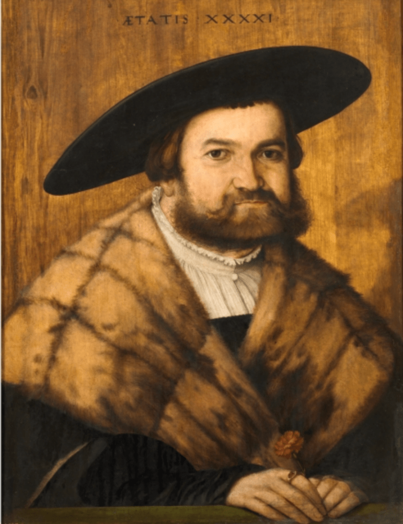 Portrayed at less than half-length, the sitter wears a large cap and clothing with a fur collar in the northern style. He holds a carnation in his hands, with a signet ring whose coat of arms consists of a crossed ax and scythe. That coat of arms on his ring confirms that he is a member of the Zörer family, but his identification with the goldsmith, Jorg Zörer, is uncertain. The inscription at the bottom confirms that it was painted when the sitter was forty-one years old. In this work, which is paired with a portrait of the sitter´s wife (P02184), Amberger endows the personage with a serene placidity that contrasts with the severity of traditional Germanic portraiture, although it is in keeping with its capacity to reflect the sitter´s psychological state. This painting was listed among those belonging to Queen Isabel Farnesio in 1746
