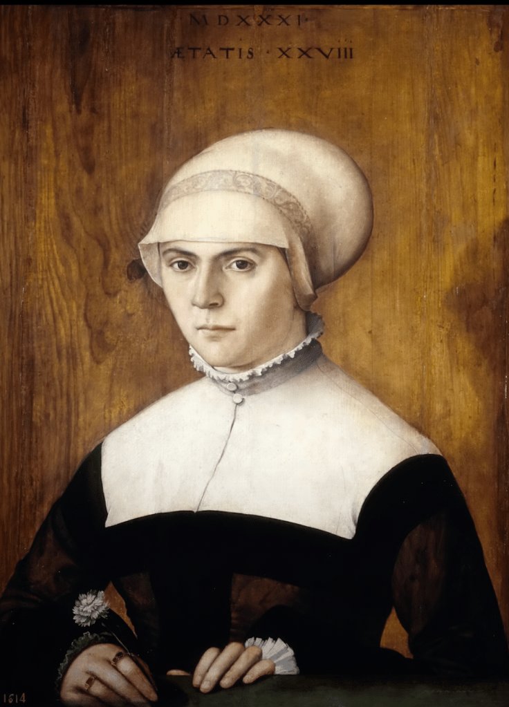 This bust portrait is a companion to that of the sitter´s husband (P02183). Shown at somewhat less than half- length, she wears a white, Nordic-style cap and a severely cut dress, and holds a white carnation in her right hand. According to an inscription in the upper part of the work she is twenty-eight. By placing her over a background that simulates a wooden surface, Amberger achieves an effectively realistic sense of space, displaying his skill as a portrait painter. This work was first listed in 1746 as part of Queen Isabel Farnesio´s collection.