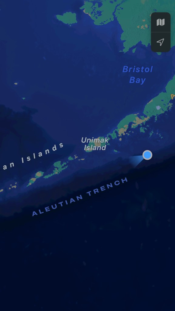 Part of the Hall of Planet Earth. The Aleutian Trench, extending 2,900 kilometers from the Gulf of Alaska to Kamchatka, marks the place where the Pacific plate is being subducted beneath the North American plate. The two plates are approaching each other at about 6 centimeters a year. The Aleutian Trench is four miles deep at its deepest point, near the west end of the Aleutian Islands. It is between 80 and 160 km (50 and 100 miles) wide. The trench reaches depths of 7620 m (25,000 ft) in some places. Both ends of the trench stop at a triple junction where three crustal plates meet at the southeast coast of Alaska and the Kamchatka Peninsula in Russia.