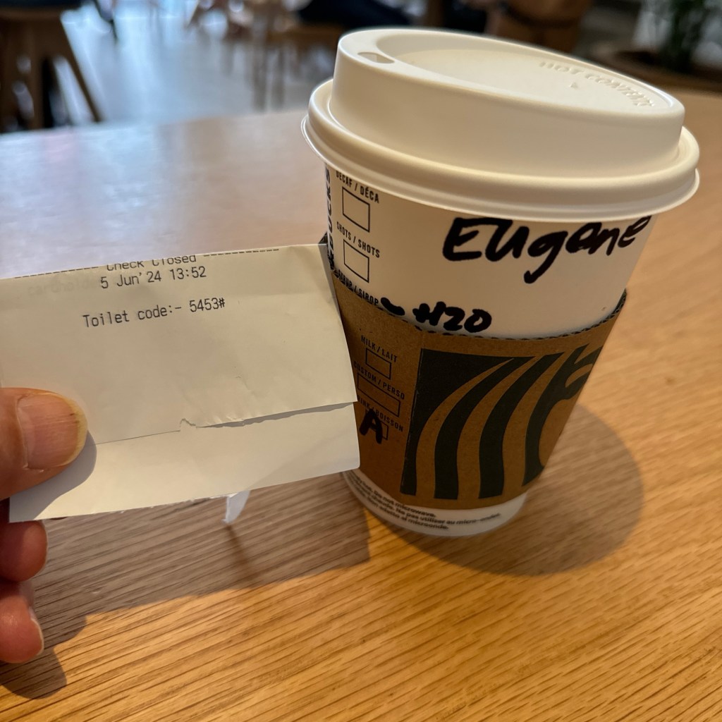 Coffee, double expresso, 2/3 water with washroom code, 4€