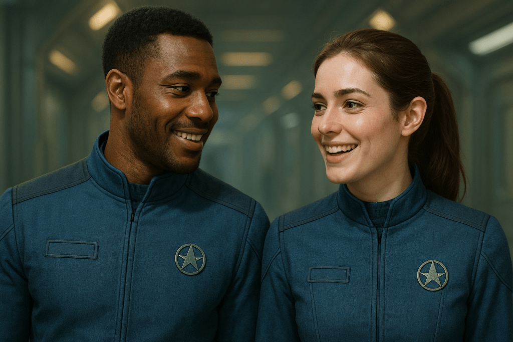 Kyra left Engineering with the faint fatigue of routine still clinging to her. In the corridor, she nearly collided with Lieutenant Marrek—communications officer, sharp-witted, always carrying that quiet confidence she admired.