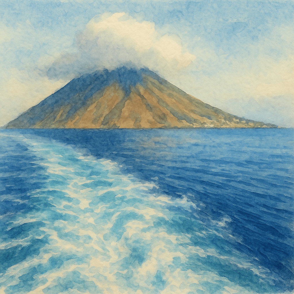 The ship carved a pale wake through the deep blue, a single gesture of motion across an ancient stillness. Ahead, Stromboli rose from the sea like a sleeping animal—its flanks rough with memory, its crown veiled in a low, breathing cloud. The island seemed both near and unreachable, a place that existed more in time than in space.
