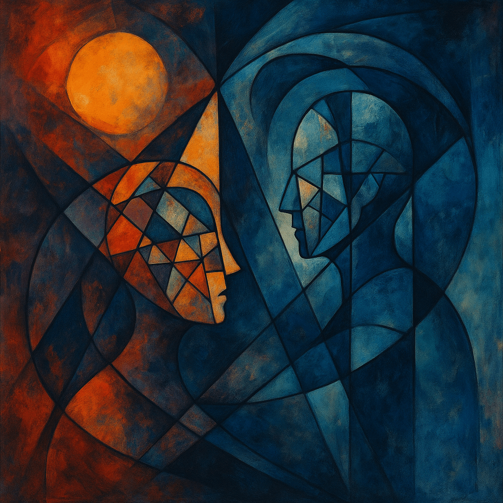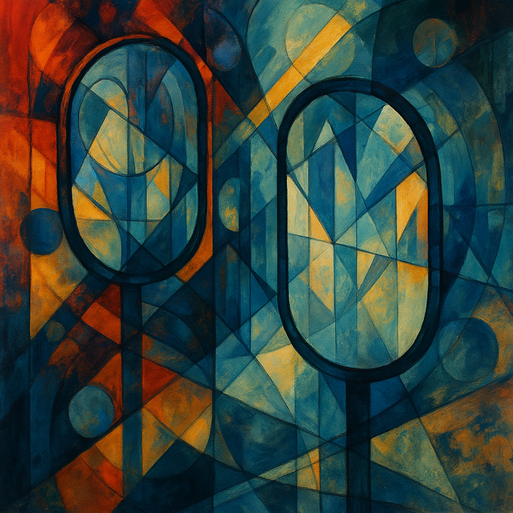 The first mirror is inward—two ovals reflecting fragments of the same self. Its geometry feels analytical, almost architectural, as though the act of seeing is also an act of building. Warm and cool tones mingle but stay distinct; awareness hasn’t yet merged with feeling.