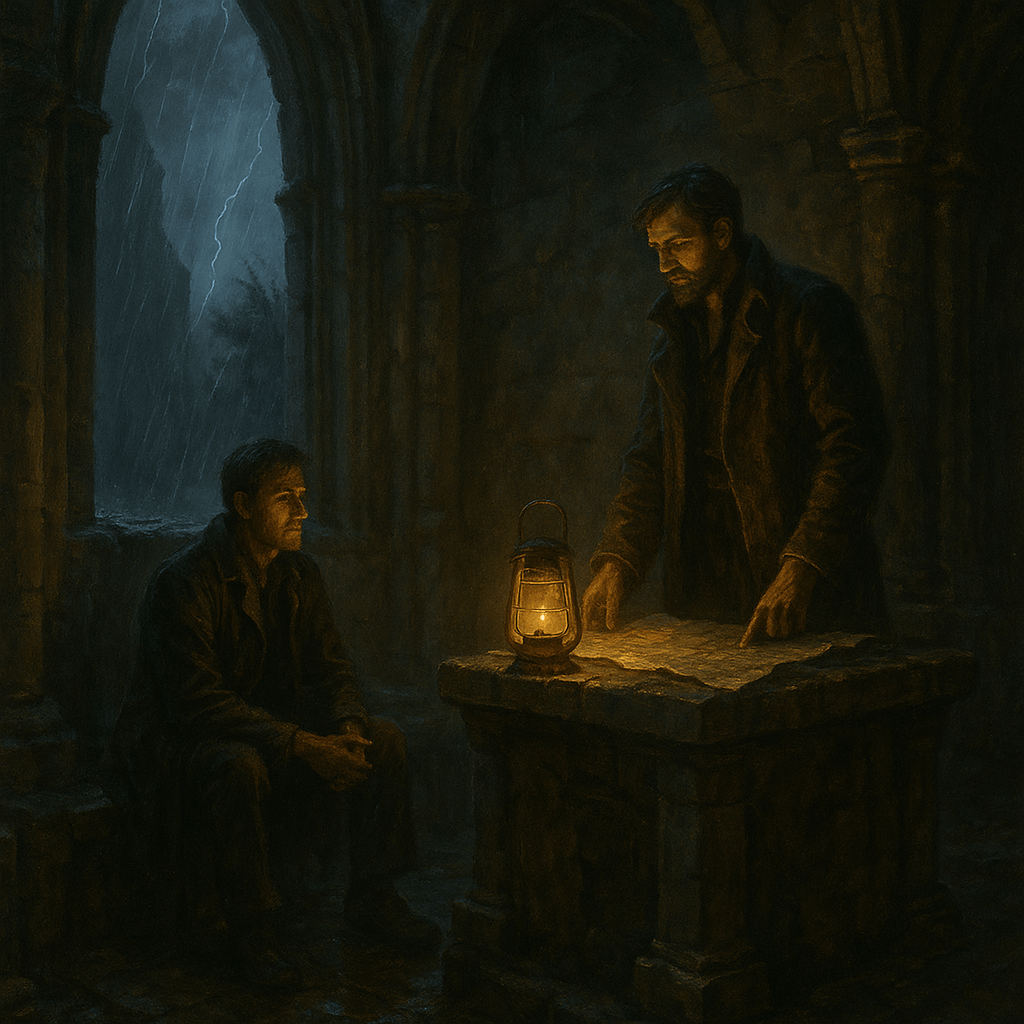 Neither man moved. Only the storm did, wrapping the abbey in its wet, patient noise.