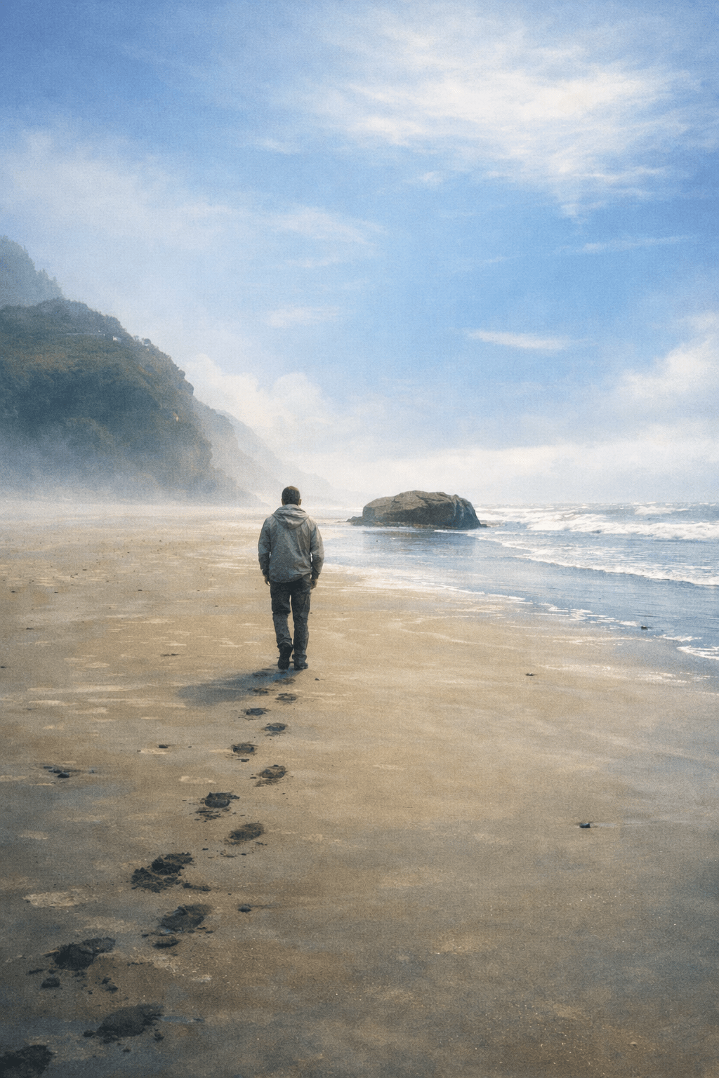 The sand held his footsteps briefly, then released them. Each step reduced something. The horizon did not respond. The water kept its own interval. Light moved first, ahead of thought—flattening urgency, making looking sufficient. Not beauty. Not escape. Cues.