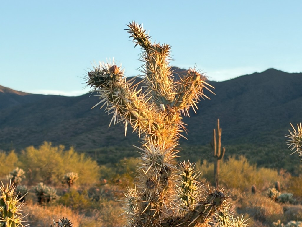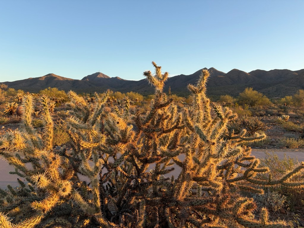 What you’re seeing — The golden glow on the spines is from low-angle sunlight (sunrise or sunset), which is a classic way cholla are photographed because the backlit spines create an almost luminous halo effect.