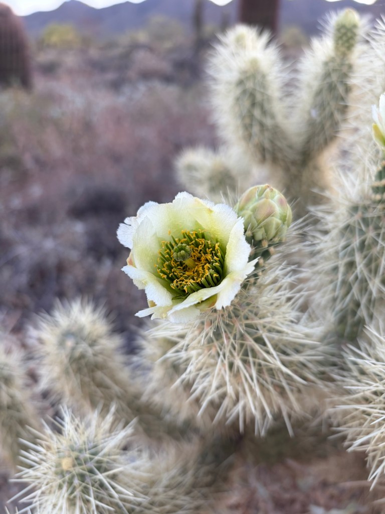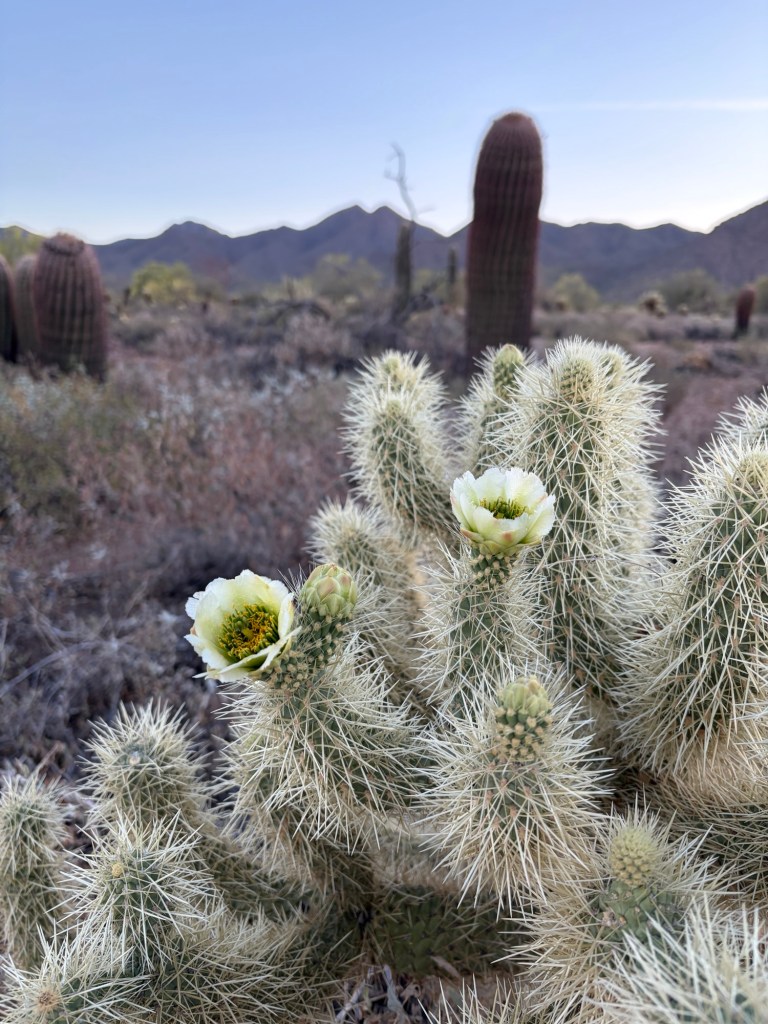 A fun/terrifying fact — Cholla segments detach extremely easily and seem to “jump” onto passing animals and hikers (earning some species the nickname “jumping cholla”). The barbed spines are nearly impossible to remove by hand — the recommended method is using two sticks to flick the segment off.