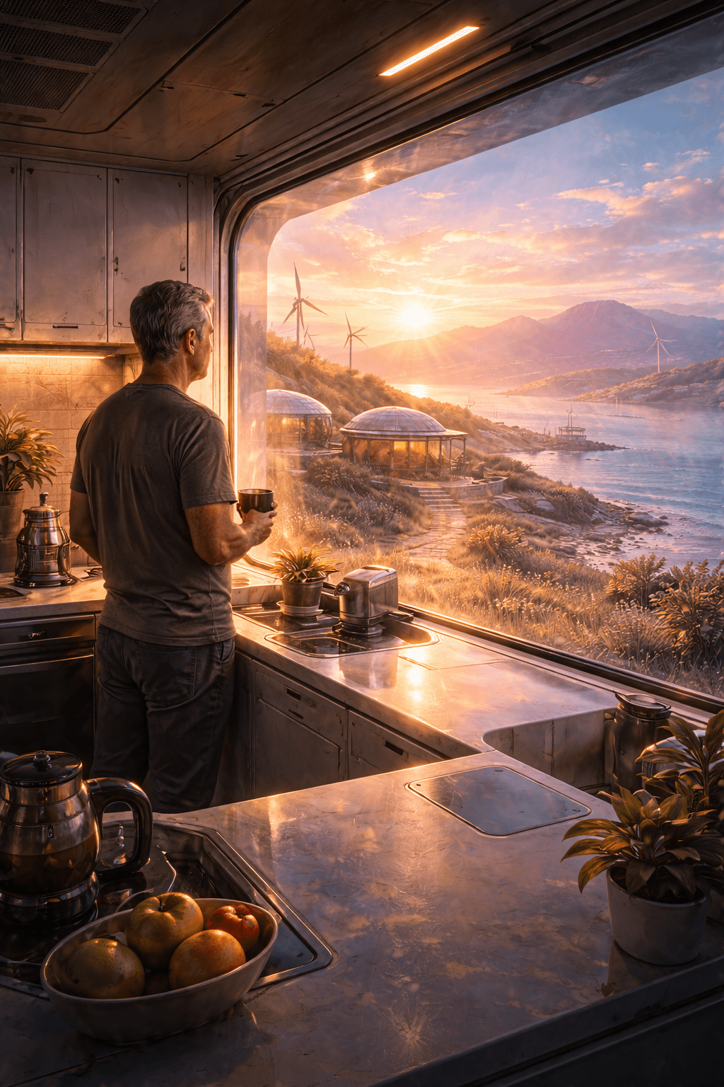 Elias Duran stood in the galley of his habitat module, one hand on the counter while the house woke around him. The climate membrane had just shifted from night mode to dawn simulation. Light the color of early Earth moved slowly across the floor. Outside the smartglass, the settlement was still half-asleep — low angular homes, gravel paths, heat baffles, a pedestrian route tracing its careful arc along the basalt edge above the inland sea.