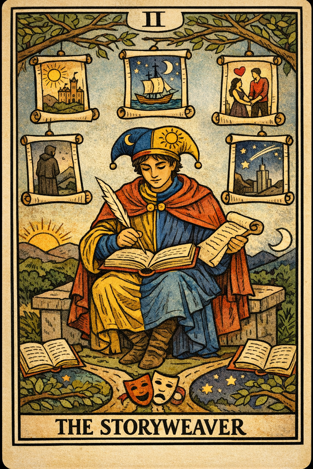 In the Rider–Waite tradition, this card depicts a figure seated between day and night, quill poised above an open book. Around them hang five scrolls, each showing a different world: a castle beneath the sun, a ship under moonlight, lovers joined by a heart, a cloaked wanderer before a mountain, and a seeker facing a tower beneath a comet. The Storyweaver’s robe blends blue and gold, and their split hat bears the symbols of sun and moon—duality held in balance.