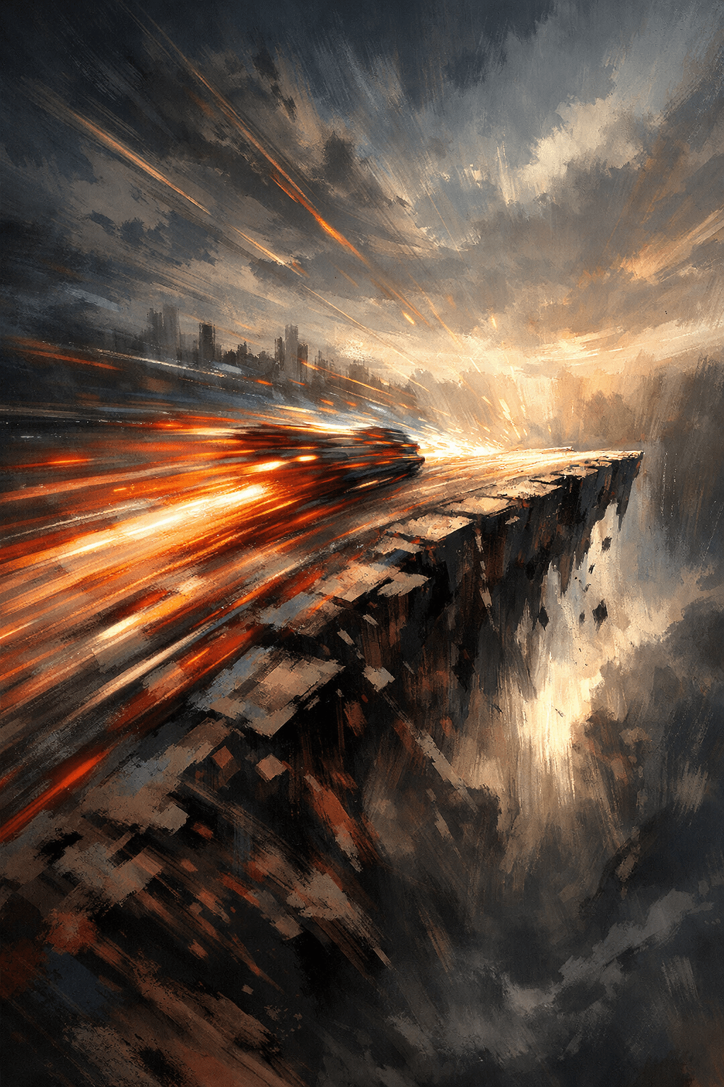 The most immediate reading is momentum without wisdom — the image of something moving very fast toward an edge it either doesn’t see or can’t stop itself from reaching. There’s a quality of compulsion in it. Not falling, not being pushed. Racing. Which means there’s agency involved, and that agency is the troubling part. Something is choosing the speed, or has chosen a direction it can no longer unchoose.