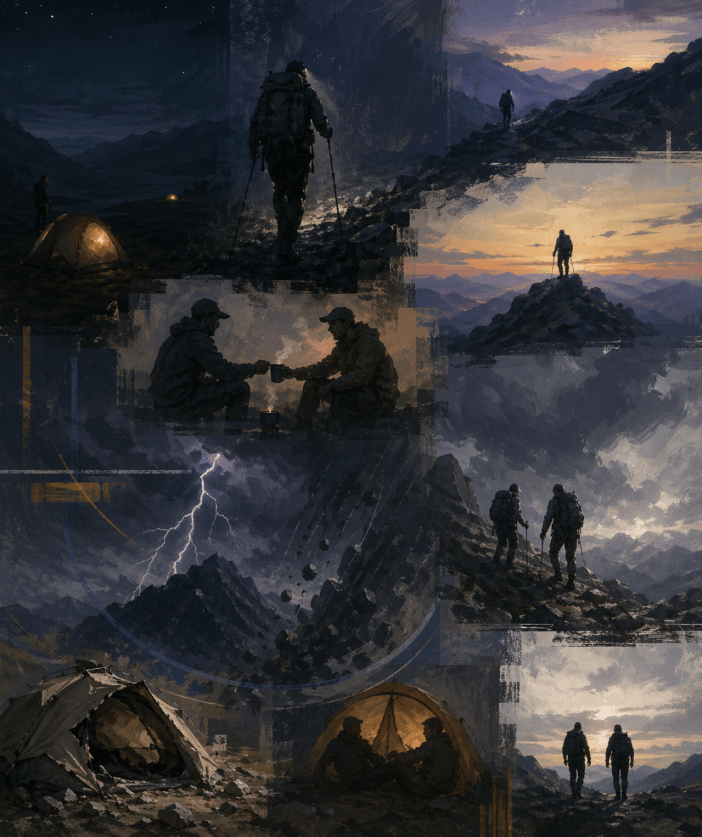 The ground was already cooling. He chose a spot without overthinking it—flat enough, slightly raised, a clean line of sight toward the slope he would take at midnight. The routine was familiar: pitch, anchor, check, minimal adjustments. No perfection, just done.